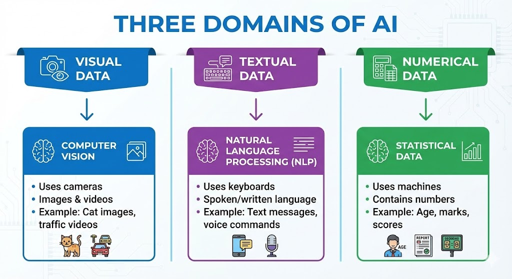 Just like humans see the world, understand language, and work with numbers, AI also works in three main areas: