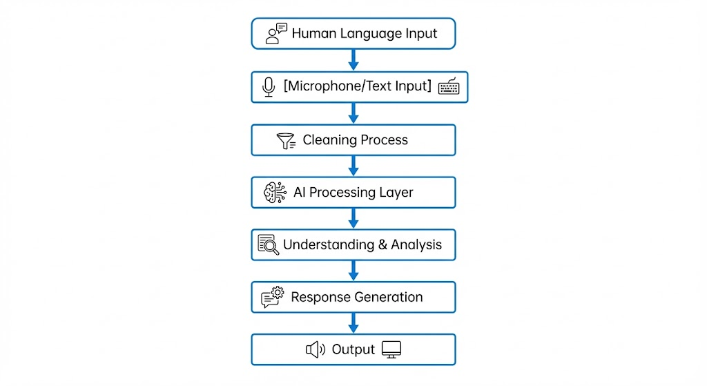 NLP processes human language to make sense of it in a way computers can understand. The input speech or text is cleaned to make it easier for computers to process. Computers use learning-based AI to analyze the input and generate appropriate responses.