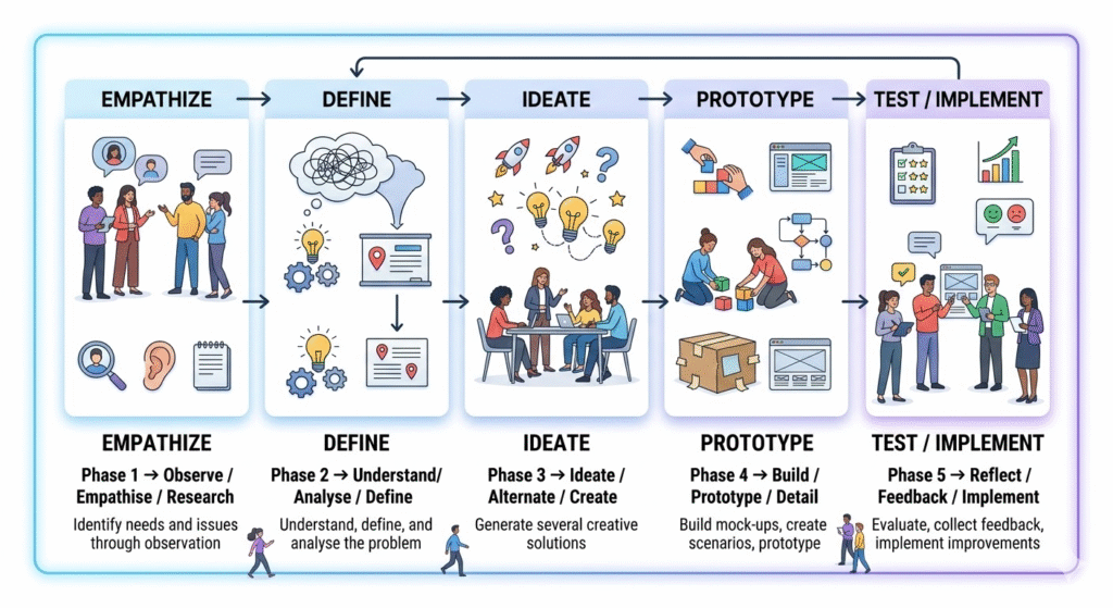 A Design Thinker applies the Design Thinking process to solve problems and find creative, innovative solutions in any field or domain — arts, social sciences, law, medicine, engineering, business, or even at home.