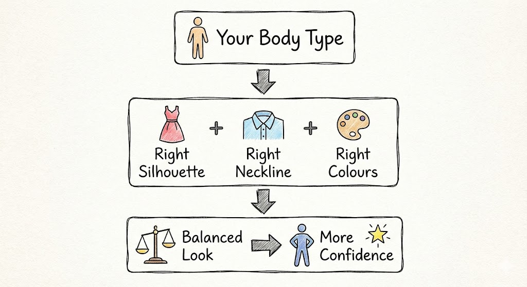 Dressing is not just about wearing clothes; it is about expressing who you are. When you understand your body structure and choose outfits that balance and highlight your best features, you naturally look confident and comfortable. Every body is unique and beautiful. The aim is never to change your body, but to select clothes and accessories that suit your body type and reflect your personality.