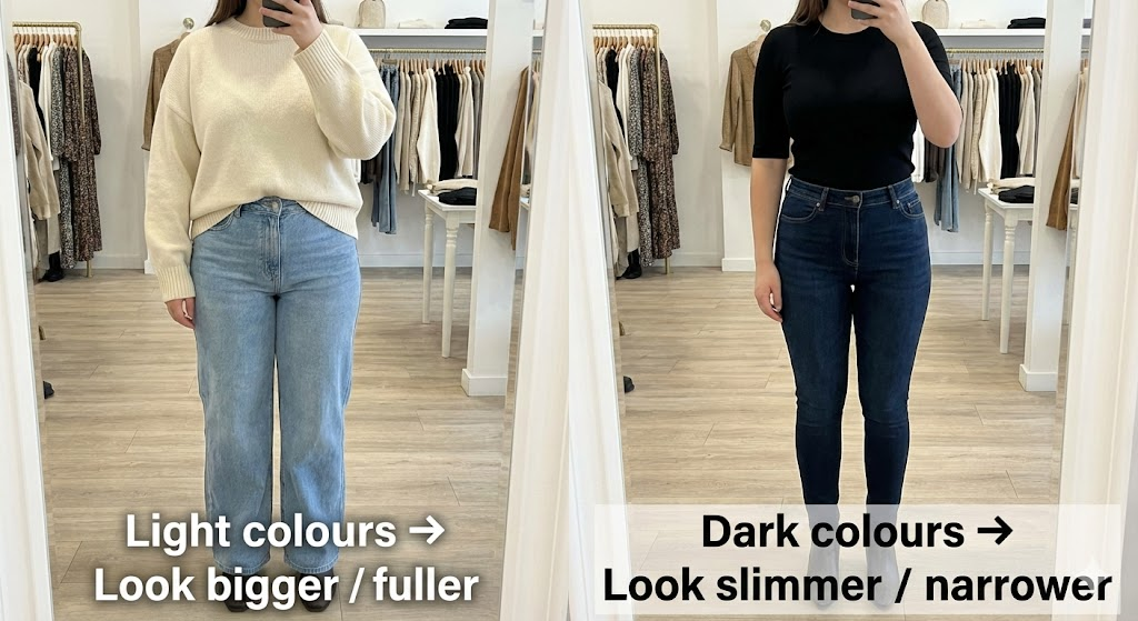 • Dark colours (navy, charcoal) for a slimming effect.