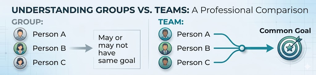 A group consists of individuals who share common characteristics but may or may not have common goals. A team, however, always works towards a shared common goal.