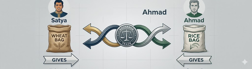 • They exchange one bag each — Satya gets rice and Ahmad gets wheat.