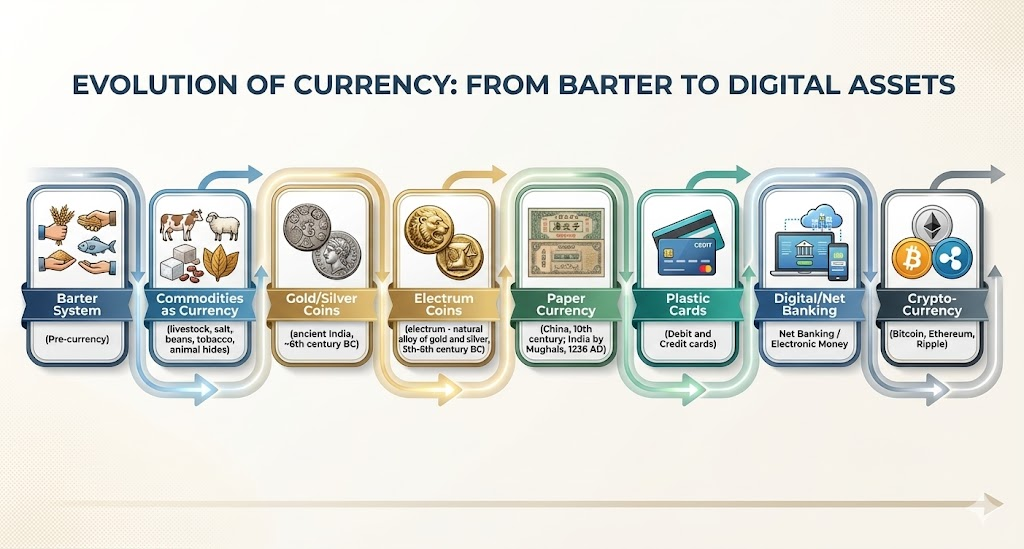 The limitations of the barter system led to the development of money. Here is how money evolved over time: