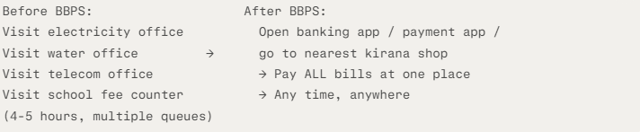 Before BBPS, consumers had to visit multiple payment centres, stand in long queues, and spend 4–5 hours paying various bills. NPCI, under RBI’s guidance, launched BBPS in 2017 as a one-stop solution for all recurring bills.