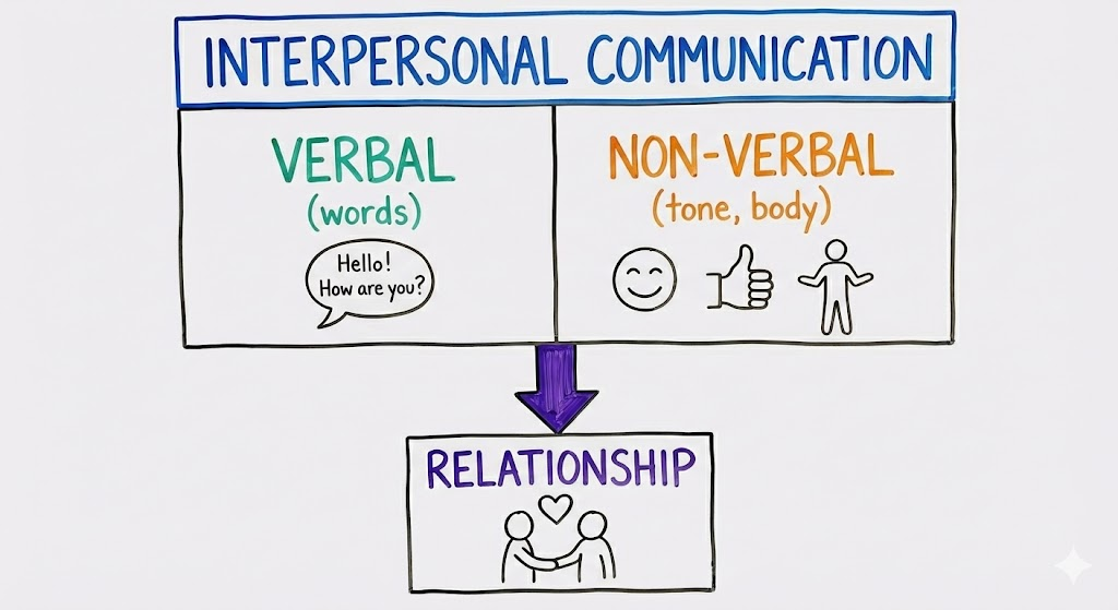 Interpersonal communication means how we send and receive messages between people. It includes words, tone, body language, listening, and emotions. For students, strong interpersonal skills improve friendships, teamwork, and confidence. This chapter shows, through a story, how communication style can unite a team or discourage it.