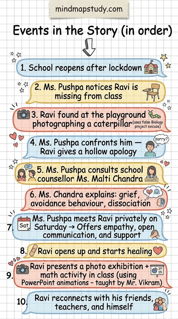 Ravi skipped his Mathematics lesson because his mother was also a Mathematics teacher. Attending the Math period reminded him painfully of her, triggering what Ms. Chandra called avoidance behaviour. He went to the playground to photograph a caterpillar as a way to cope and used a false Biology project excuse to justify being out of class.