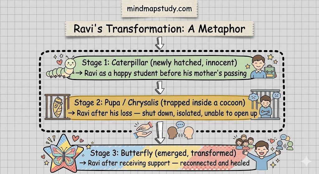 Ravi uses the metamorphosis of a caterpillar into a butterfly. Just as a caterpillar goes through a painful, enclosed stage in a cocoon before emerging, Ravi had been trapped inside his own grief. With time and support, he was able to emerge and transform.